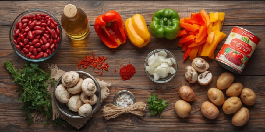 Assemble all the bean goulash ingredients on the preparation table.