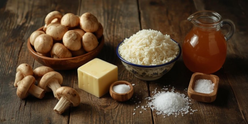 Assemble all the braised rice with mushrooms ingredients on the preparation table.