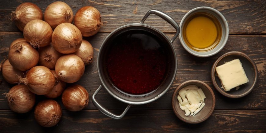 Assemble all the brown onion sauce ingredients on the preparation table.