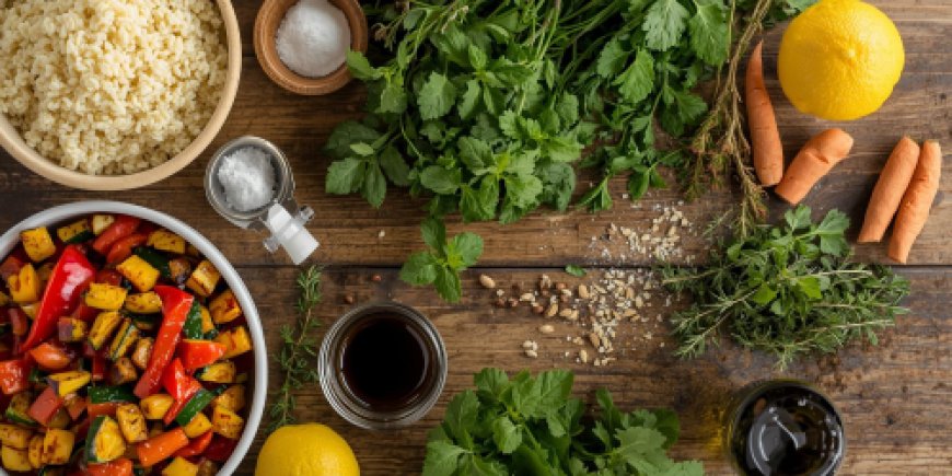 Assemble all the Couscous Salad with Roasted Vegetables and Mixed Herbs ingredients on the preparation table.