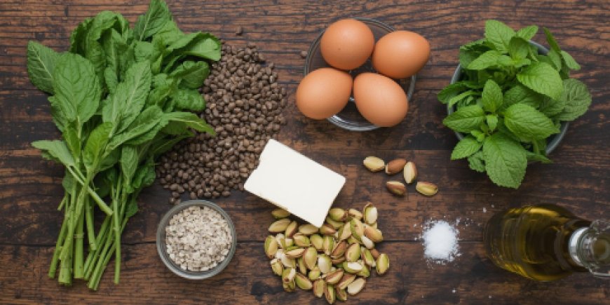 Assemble all the Feta, Mint, Lentil, and Pistachio Omelette ingredients on the preparation table.
