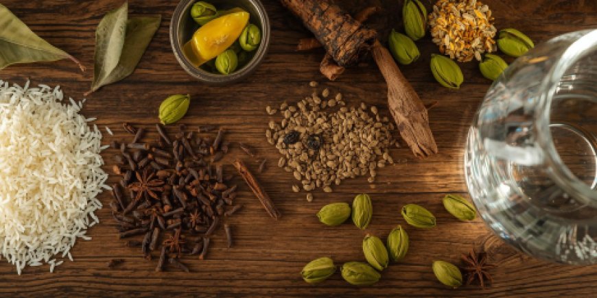 Assemble all the Indian style rice ingredients on the preparation table.
