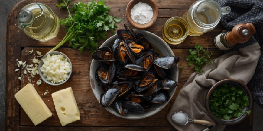 Assemble all the Mussels in White Wine Sauce Recipe ingredients on the preparation table.