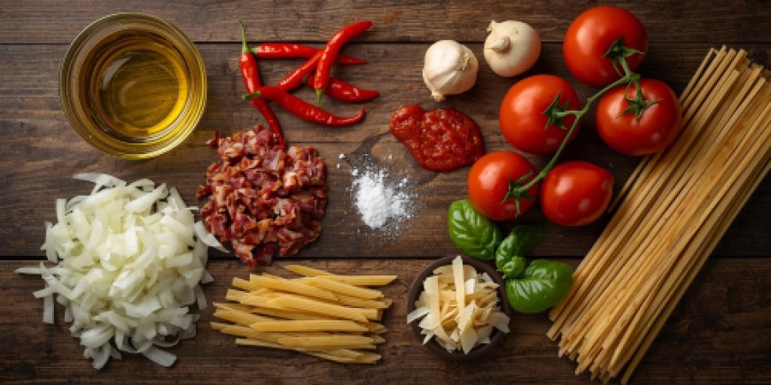 Assemble all the Penne Arrabiata ingredients on the preparation table.