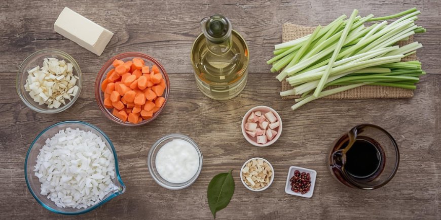 - Chop the celery, carrots, and onions into mirepoix.