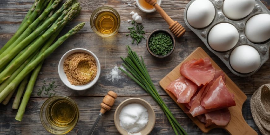 Learn to prepare poached duck egg, asparagus, cured ham, grain mustard dressing. This dressing consists of grain mustard, duck eggs, cured ham, chives, and asparagus spears. Below is a simple recipe guide with images.