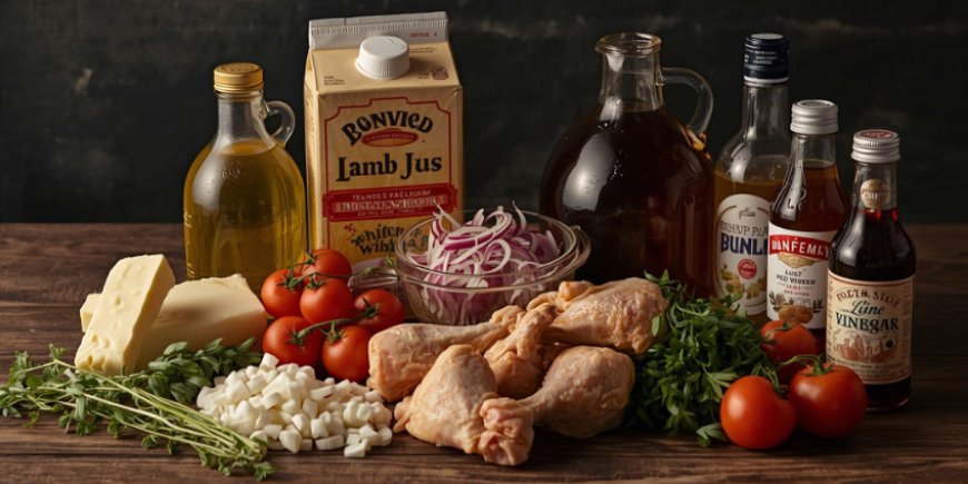 Assemble all the Roast Chicken Jus ingredients on the preparation table.