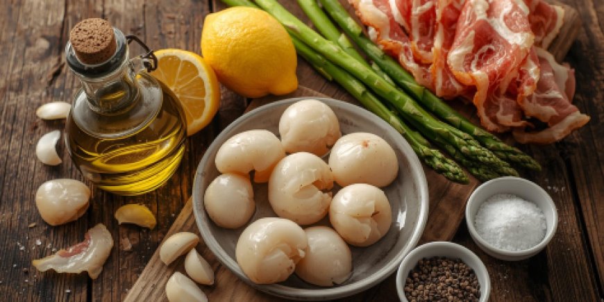 Prepare the Scallops and Bacon recipe using asparagus sticks, scallops, pancetta bacon rashers, olive oil, and lemon. Here is a simple Scallops and Bacon Recipe guide with images.