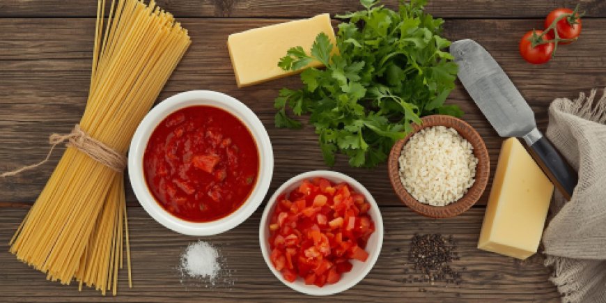 Assemble all the Spaghetti with Tomato Sauce ingredients on the preparation table.