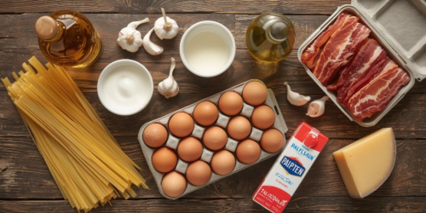 Assemble all the Tagliatelle Carbonara ingredients on the preparation table.